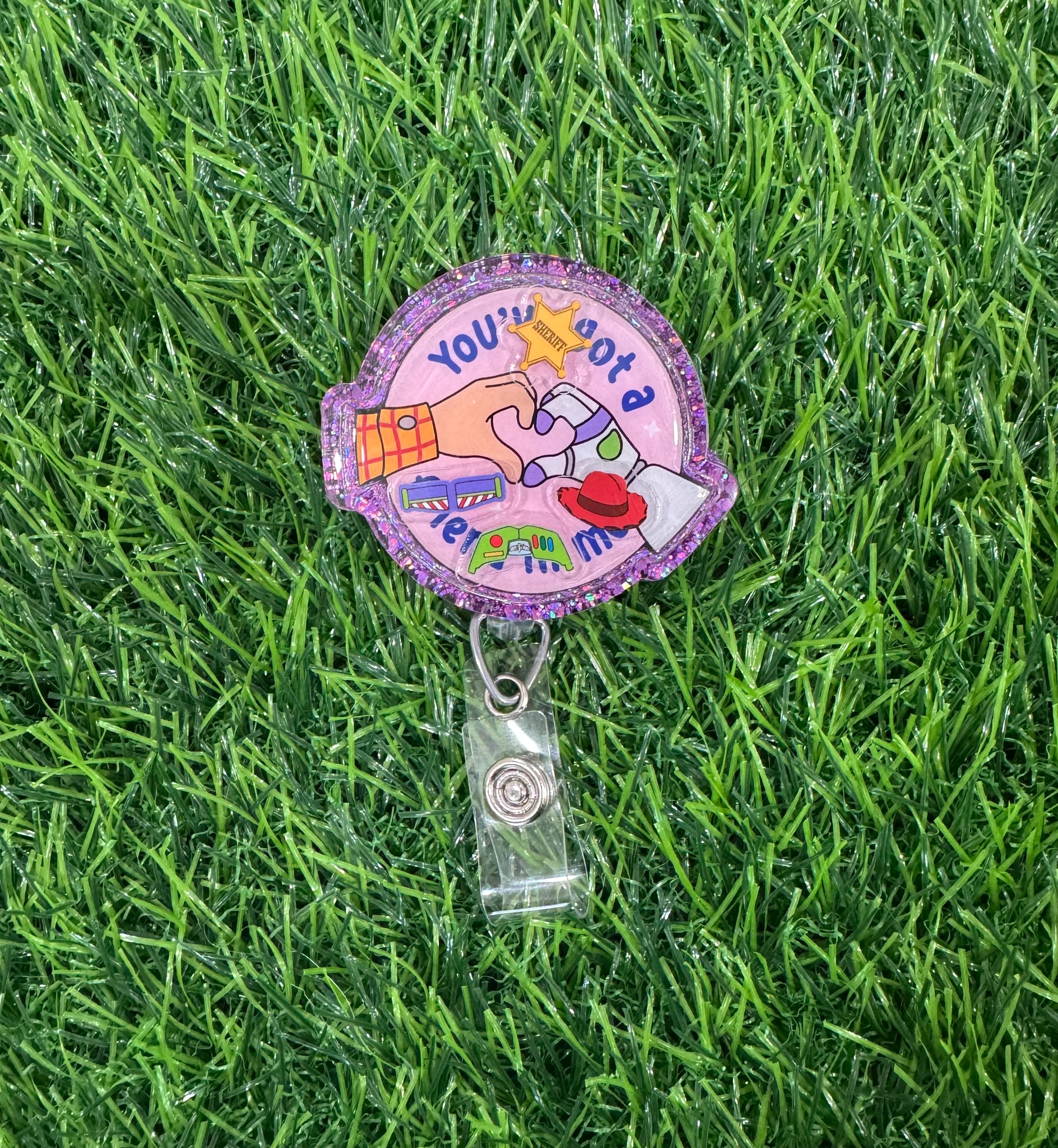Friend In Me Shaker Retractable Badge Reel Made with premium glitter, coated in epoxy for a glass like finish. Reel topper is 2” in size and is attached to an alligator swivel clip retractable badge reel.