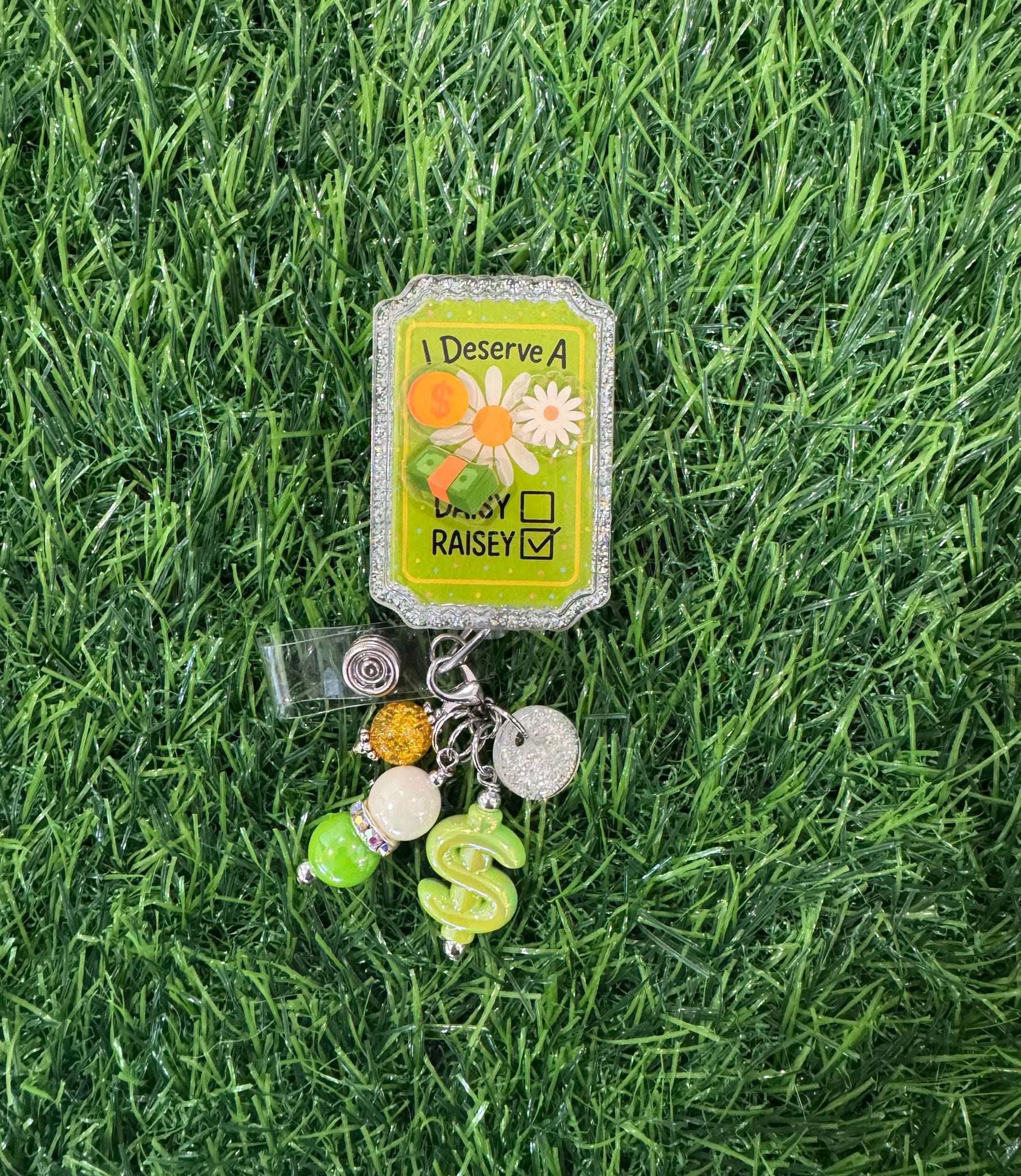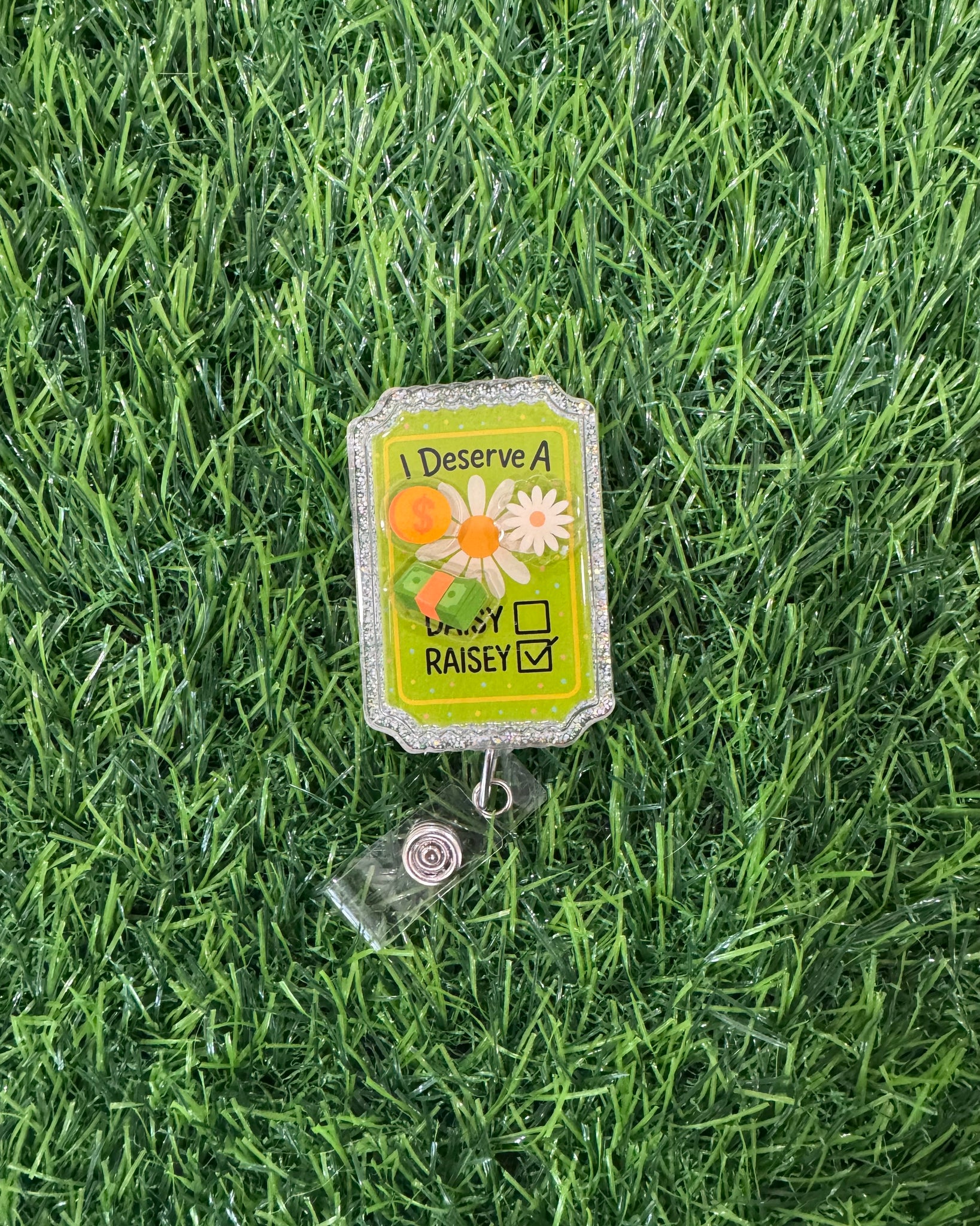 I Deserve A Raisey Shaker Retractable Badge Reel Made with premium glitter, coated in epoxy for a glass like finish. Reel topper is 2” in size and is attached to an alligator swivel clip retractable badge reel.