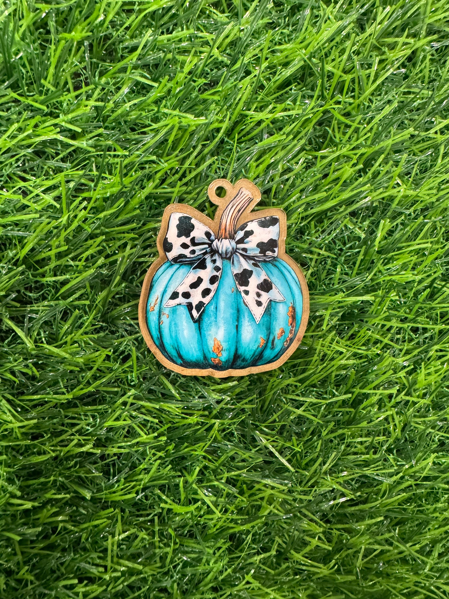 Turquoise Pumpkin With Cowprint Bow Acrylic Blank & Decal Set. This listing is for 1 acrylic blank & 1 decal sticker with mask. Decal is printed vinyl sticker with gloss laminate.