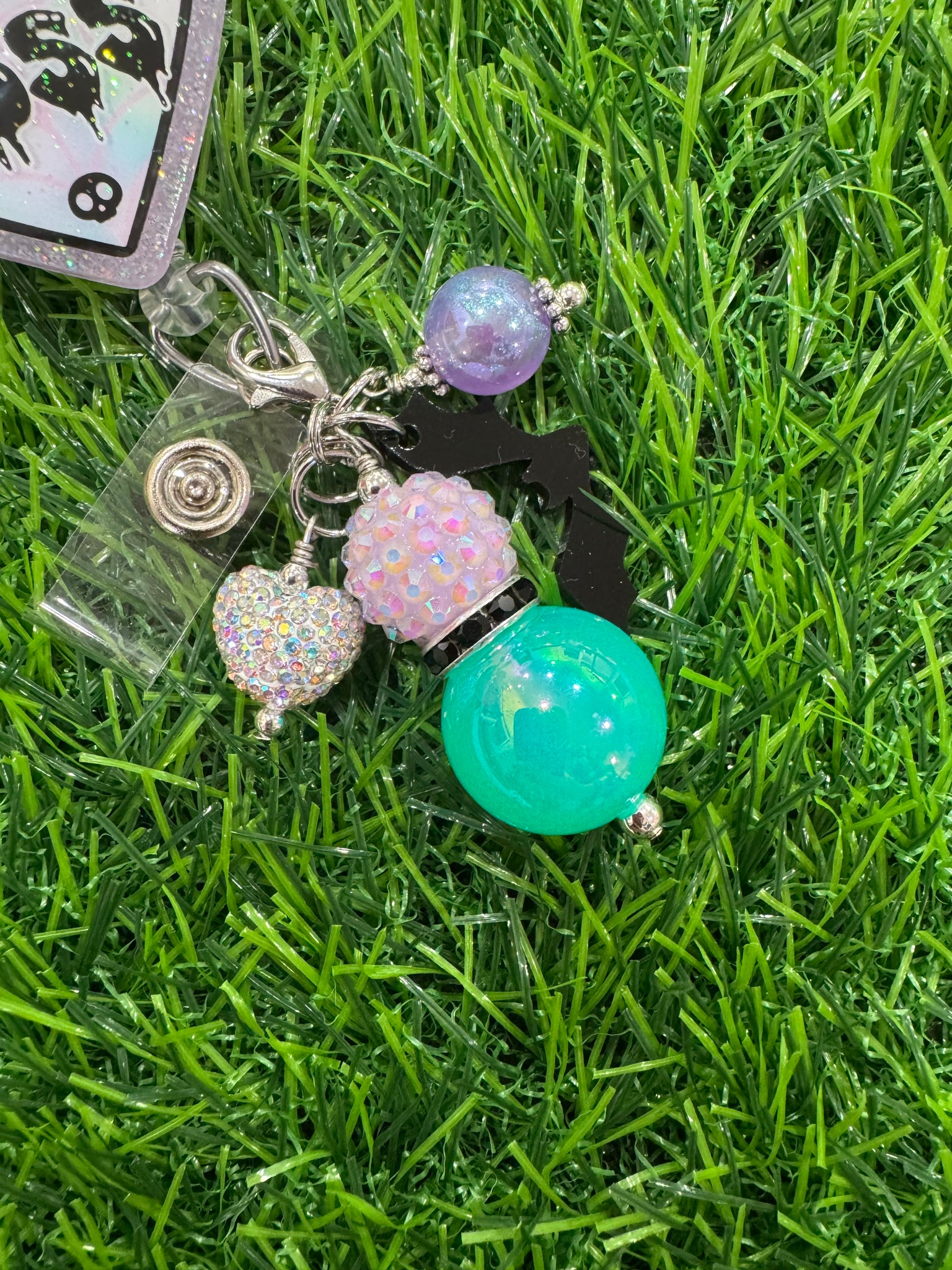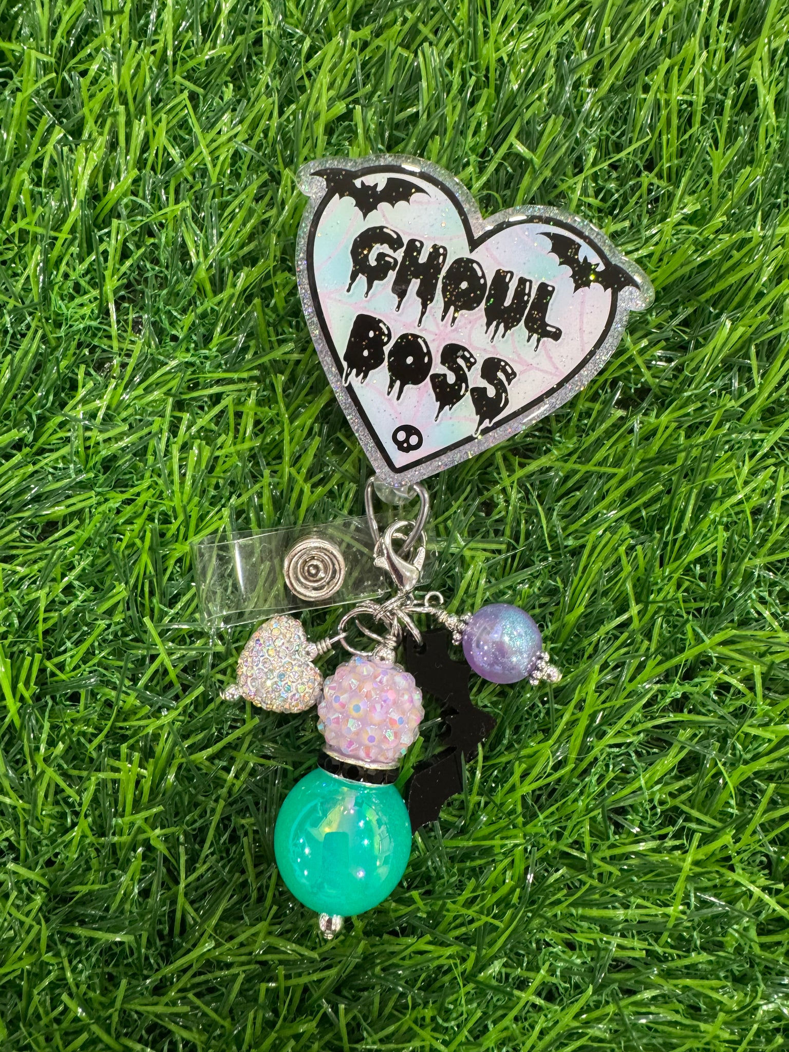Ghoul Boss Retractable Badge Reel Made with premium glitter, coated in epoxy for a glass like finish. Reel topper is 2” in size and is attached to an alligator swivel clip retractable badge reel.