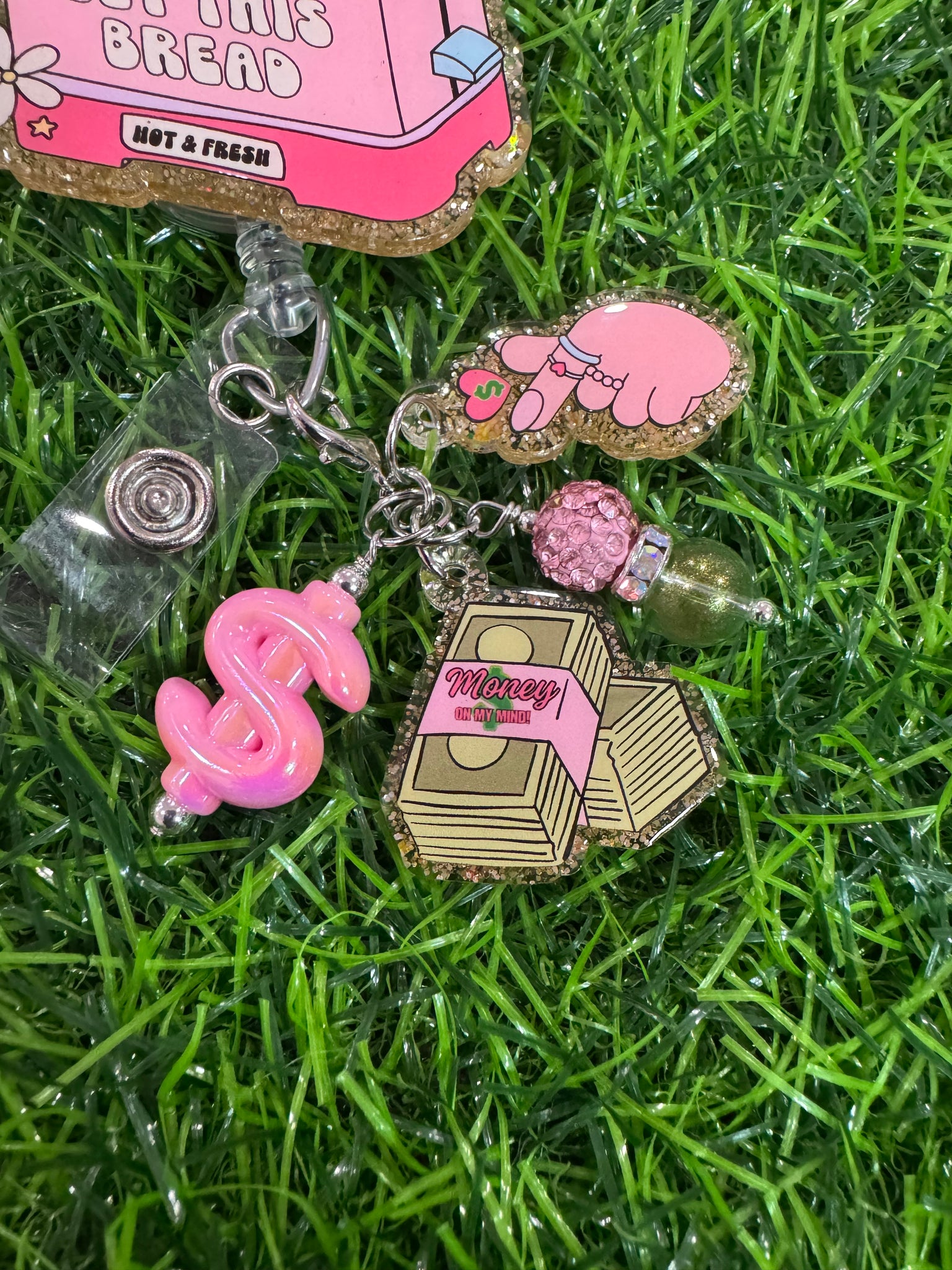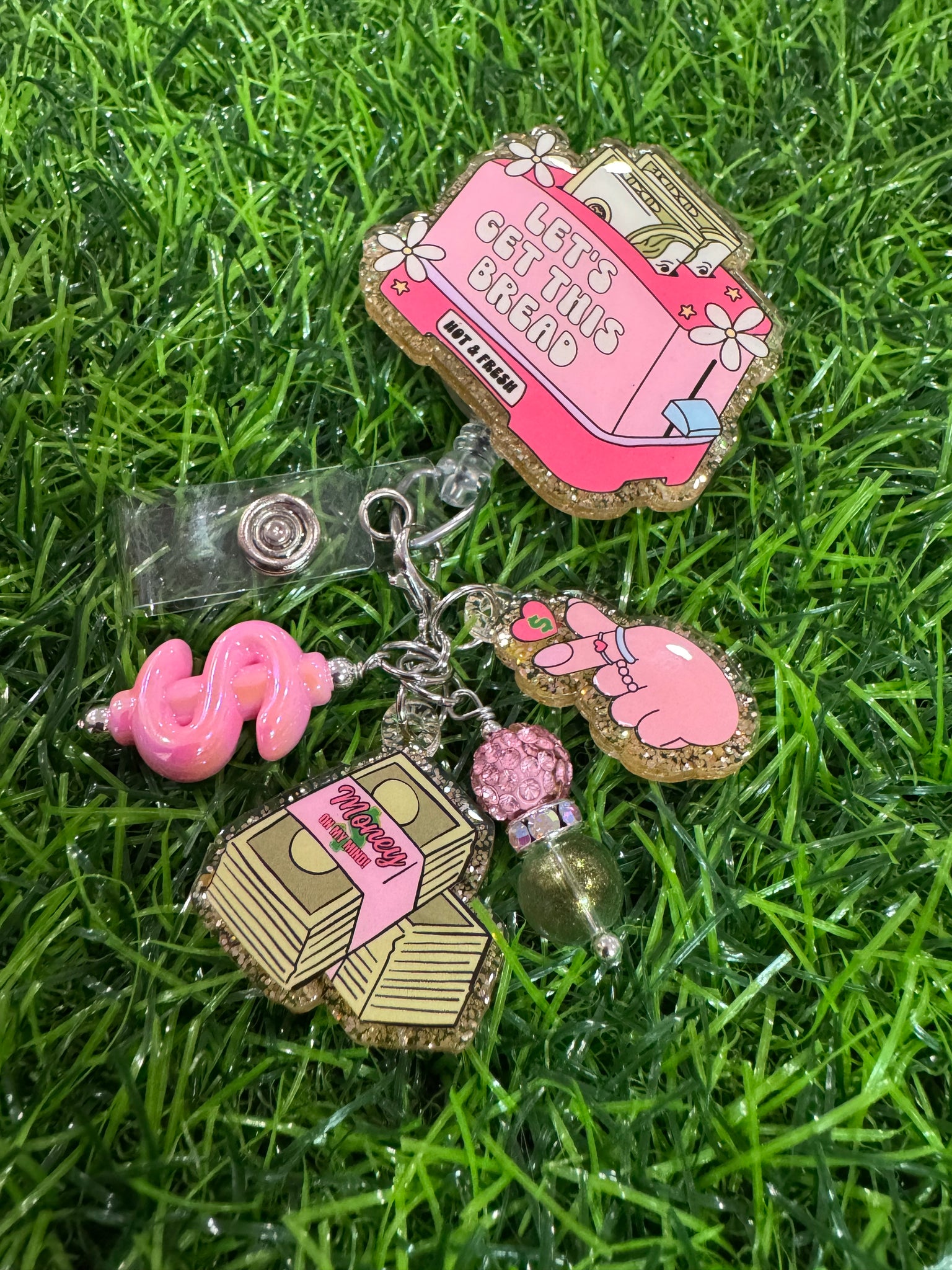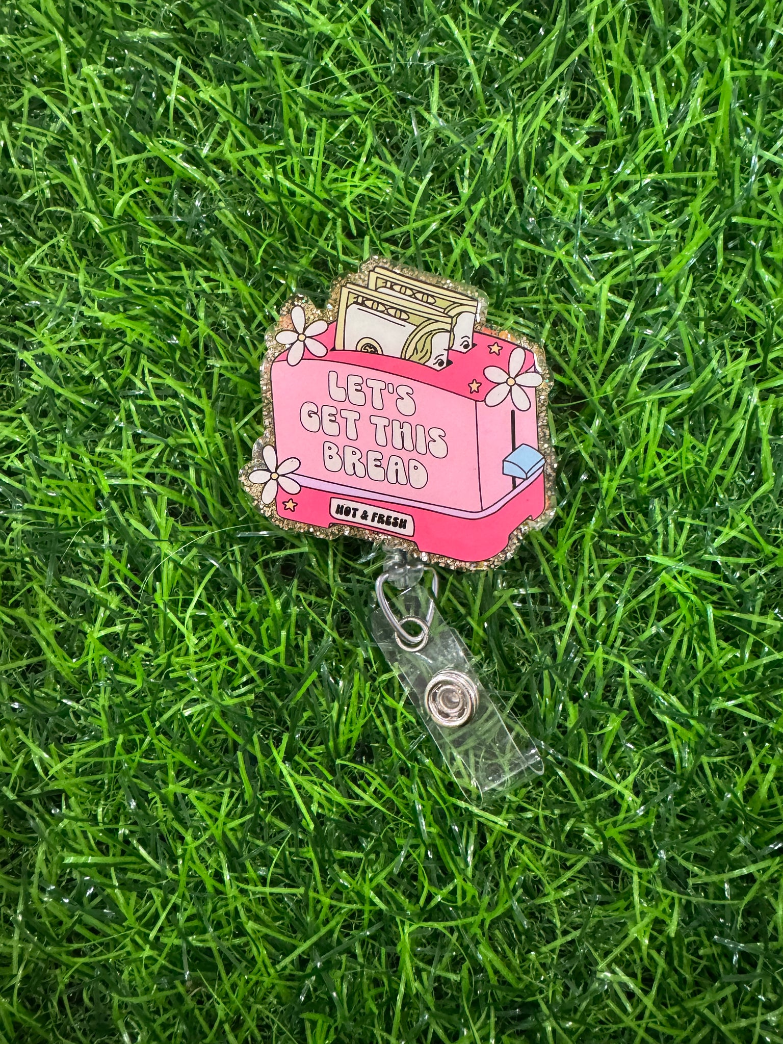 Let's Get This Bread Retractable Badge Reel Made with premium glitter, coated in epoxy for a glass like finish. Reel topper is 2” in size and is attached to an alligator swivel clip retractable badge reel.