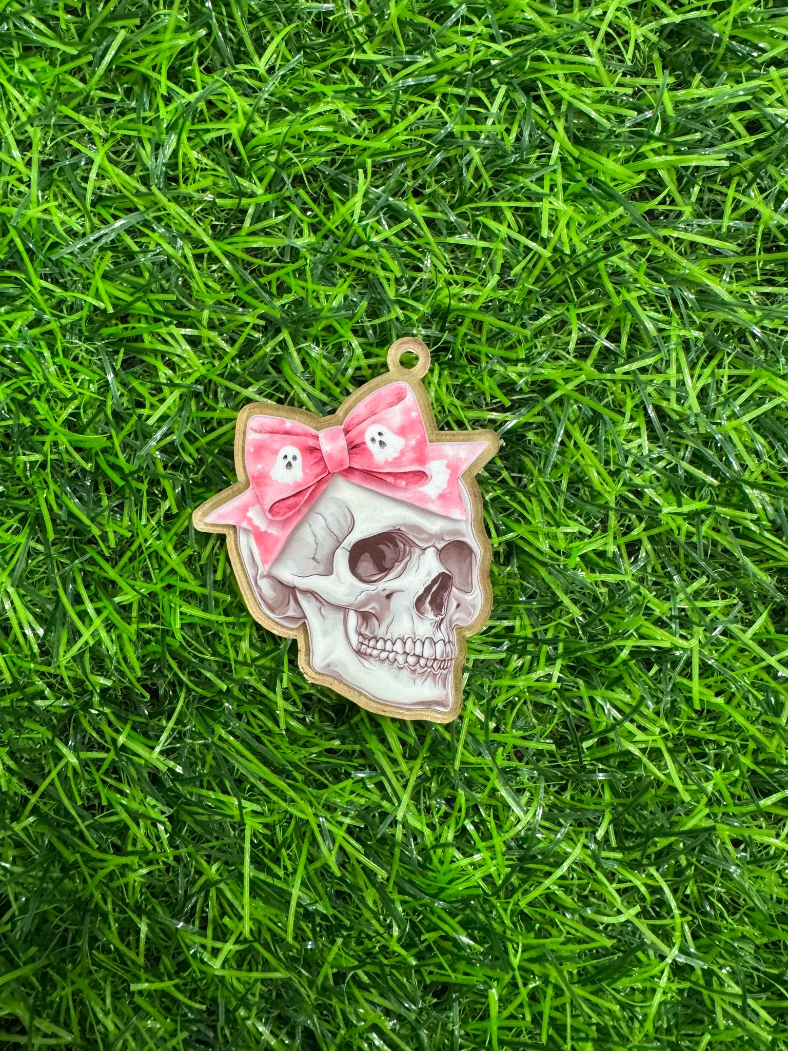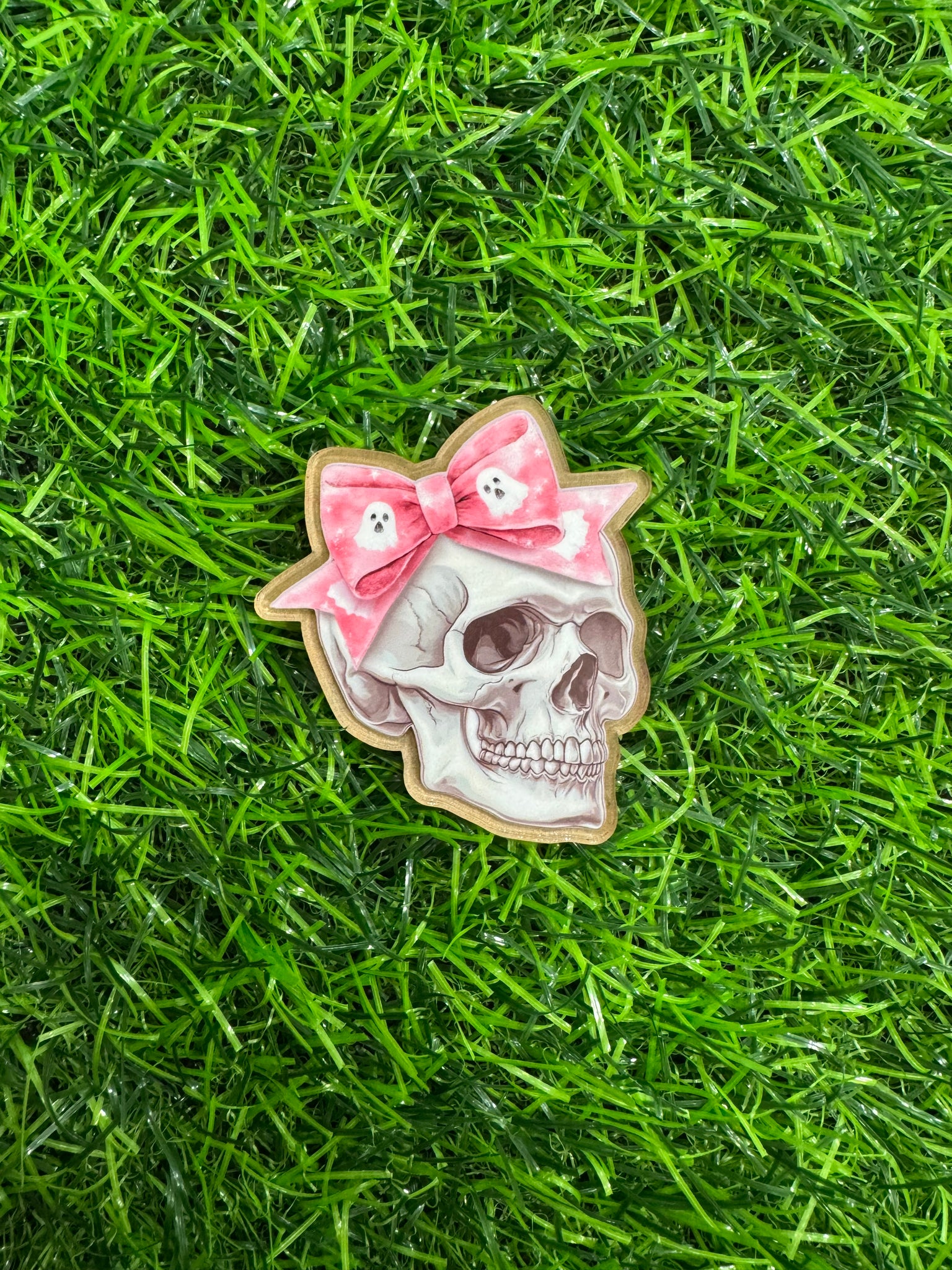 Pink Ghost Bow & Skull With Pink Ghost Bow Acrylic Blank & Decal Set. This listing is for 1 acrylic blank & 1 decal sticker with mask. Decal is printed vinyl sticker with gloss laminate.