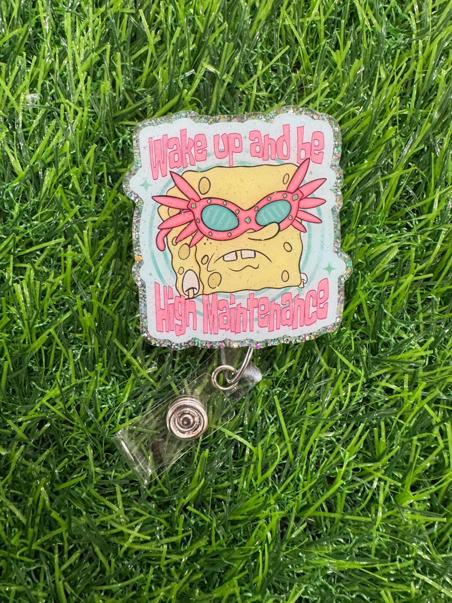 Wake Up And Be High Maintenance Retractable Badge Reel Made with premium glitter, coated in epoxy for a glass like finish. Reel topper is 2” in size and is attached to an alligator swivel clip retractable badge reel.