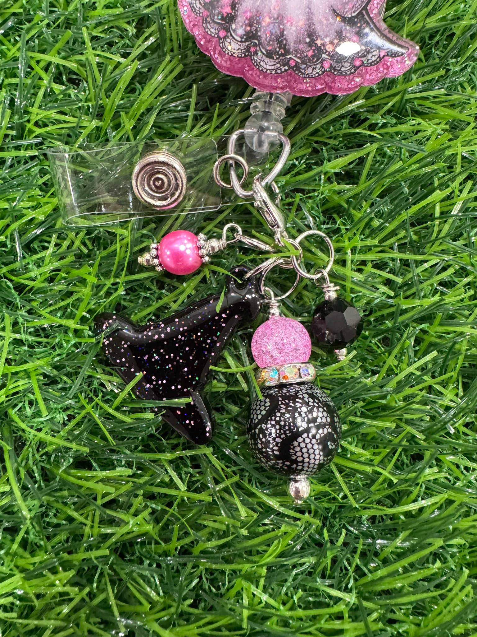 Witch Ghost Retractable Badge Reel Made with premium glitter, coated in epoxy for a glass like finish. Reel topper is 2” in size and is attached to an alligator swivel clip retractable badge reel.